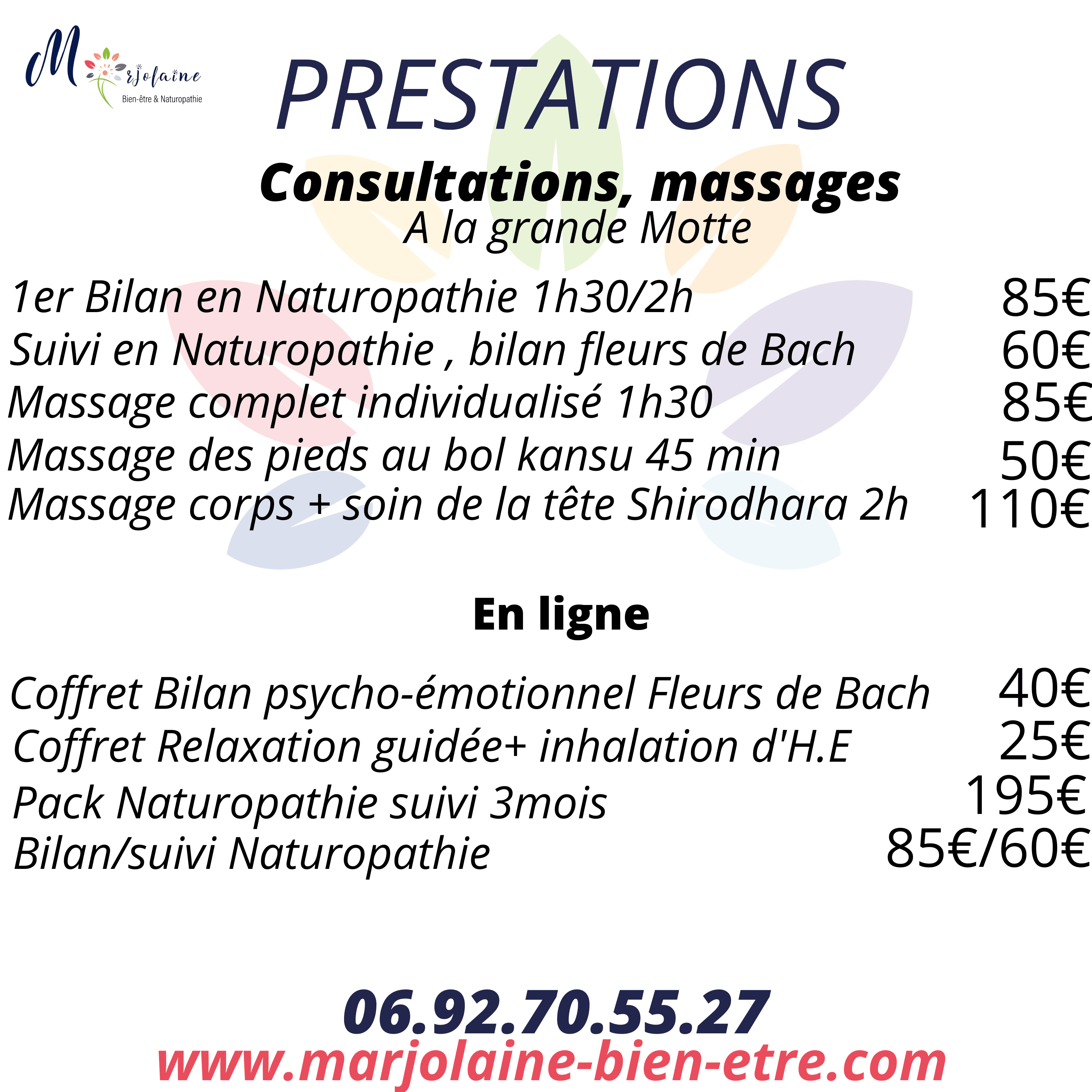 Marjolaine est une professionnelle de qualité qui sait mettre en confiance et propose une approche et des massages personnalisés de qualité ! Par la passé , je n'ai jamais été très réceptif aux massages et n'ai jamais trouvé un(e) thérapeute qui sache me mettre en confiance ... Et j'ai eu la chance de découvrir l'approche de Marjolaine lors d'un stage bien être et de profiter de l'un de ses soins (massage detox) je ne peux que recommander ses soins et conseils ... prodigués avec bienveillance , écoute, compétence et professionnalisme mais surtout avec un réel effet sur le corps et l'esprit ! Encore merci